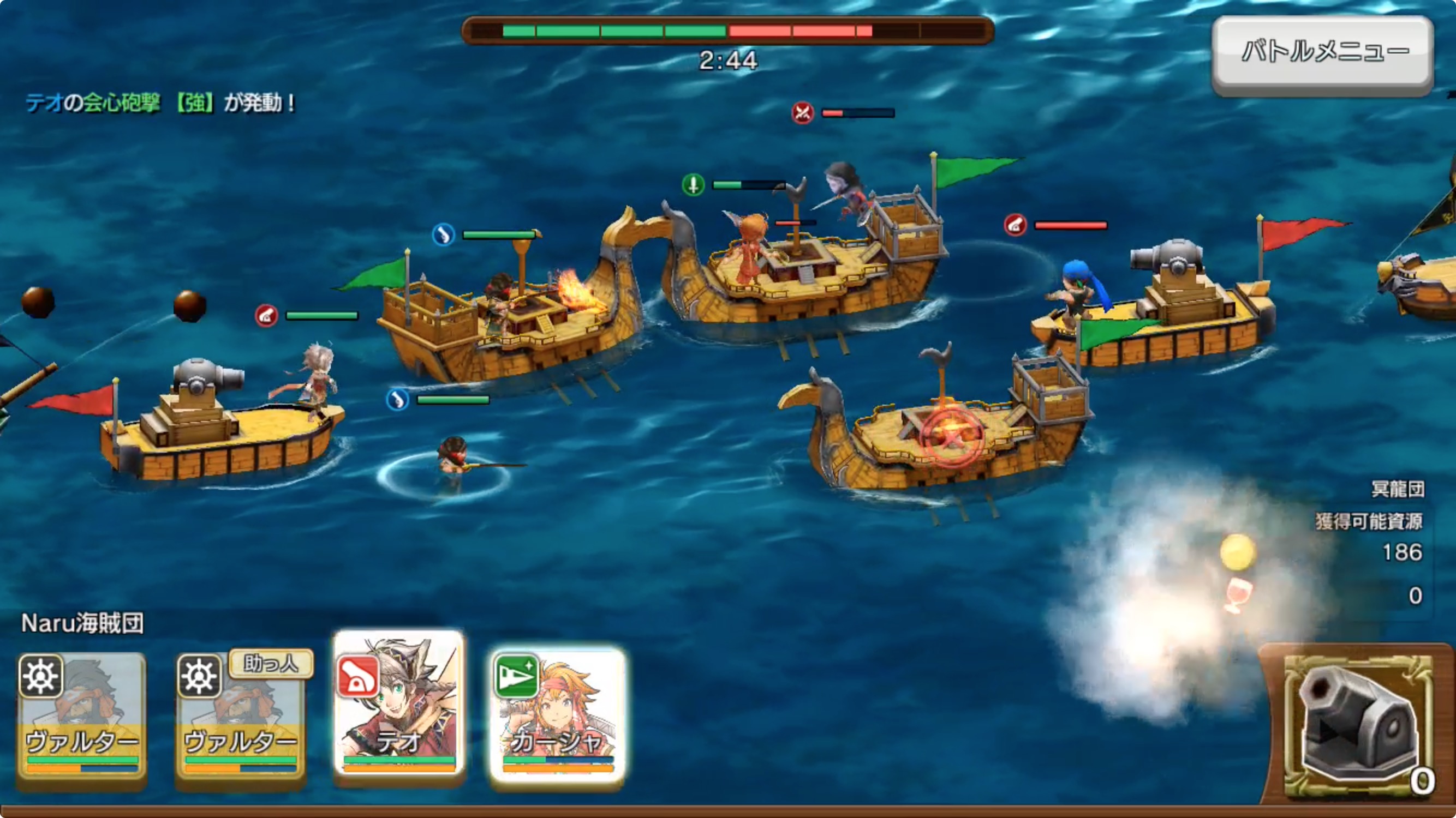 バトルは海賊同士による海戦になります。味方の船に味方ユニットが乗っており、バトルが始まると勝手に船を進めて戦い始めます!プレイヤーの出来ることは大きく2つです。